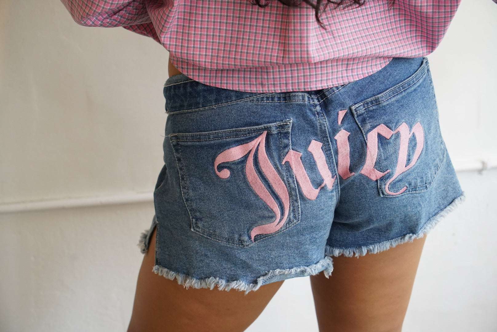 Classic denim cut offs with fringe hem, pink embroidered JUICY on back.